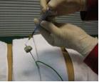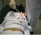 (4)测量温度:连接测温银质针与温度记录仪,开启温度记录仪,观察温度曲线10 min,然后加注1 mL95%乙醇于艾球顶端,并用点火棒点燃测温银质针针尾艾球顶端的桑皮纸引燃艾球(见图6),如为多针组艾球则先在5个艾球顶端的桑皮纸上各加注1ml95%酒精然后同时点燃(见图7),记录并观察银质针的温度变化曲线,同时用红外热像仪测量艾球燃烧时的最高温度,待艾球燃尽温度曲线平稳后继续观察10 min。测温结束时在电脑终端读出测温银质针各测温点的最高温度,并保存数据。最后吸灰、起针、局部消毒、清洁。