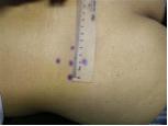 (1)定位:测温点位于在受试者左臀部内上方,髂嵴上缘最高点下7cm,后正中线旁开7cm(见图4)。如为多针组则在距测温点2cm为半径的圆周上均匀定位出4个配针点(见图5)。