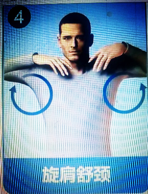 双手置两侧肩部,掌心向下,两臂先由后向前旋转20、30次,再由前向后旋转20-30次。