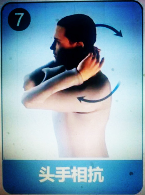 双手交叉紧贴颈后,用力顶头颈,头颈向后用力,互相抵抗5次