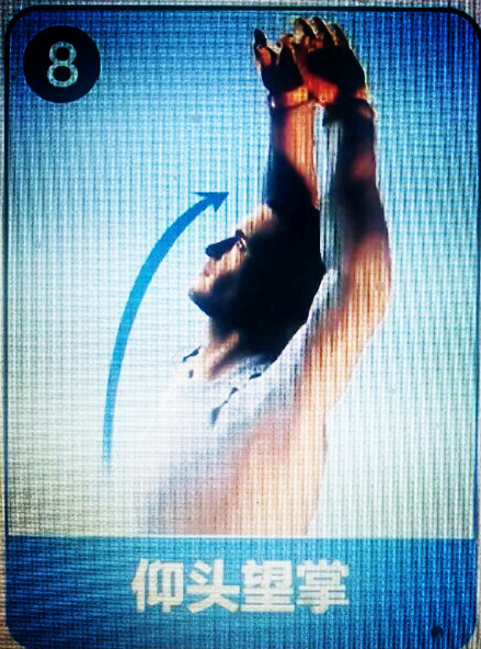 双手上举过头,手指交叉,掌心向上。将头仰起看向手背。保持5秒