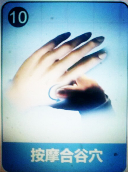 合谷穴在大拇指和食指中间的虎口处,把拇指 和食指分开,用另一手的大拇指经常按摩该处。