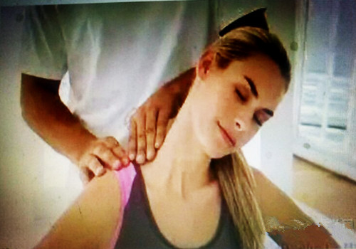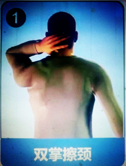用左手掌来回摩擦颈部,口中默念8下后,开始 捏后颈。然后换右手。有助于颈部放松。