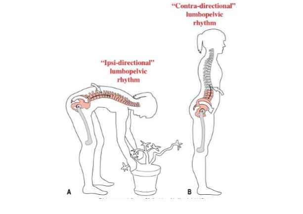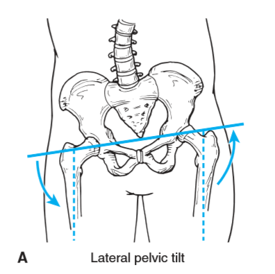 额状面的骨盆运动使得在每个髋关节处运动相反。骨盆抬高的一侧,髋关节内收;骨盆降低的一侧,髋关节外展。站立时,腰椎向骨盆抬高的一侧屈曲。