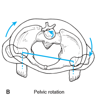 旋转发生在下肢,固定在地面上。不受支持的下肢向前或向后沿骨盆摇摆。当骨盆悬空侧向前移动,这就是所谓的骨盆向前旋转。躯干同时向相反方向转动,股骨内旋。当骨盆悬空侧向后移动,它被称为向后旋转;在稳定侧股骨同时外旋,与躯干旋转方向相反。