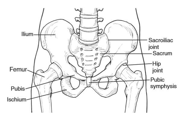 髋骨由髂骨、耻骨和坐骨共同构成,从而形成一个结构单位。左、右髋骨在耻骨联合前方相互连结,而在骶髂关节后方与骶骨相互连结。当这三个关节在骨盆区域相互传递时,轻微运动可以减少受力。但是,骨盆主要还是在闭链运动中扮演着个体的角色。