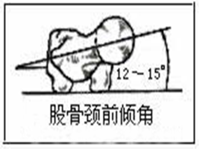 股骨的形态使其能够承受身体重量,并且通过股骨体、颈和头将地面反作用力传递到骨盆的髋臼处。在额状面上,股骨颈和股骨体之间形成一个夹角(通常125°)。前倾角是股骨颈的轴线与股骨内外髁的髁间连线间有一向前扭转的角度,范围8°--25°,平均12°。