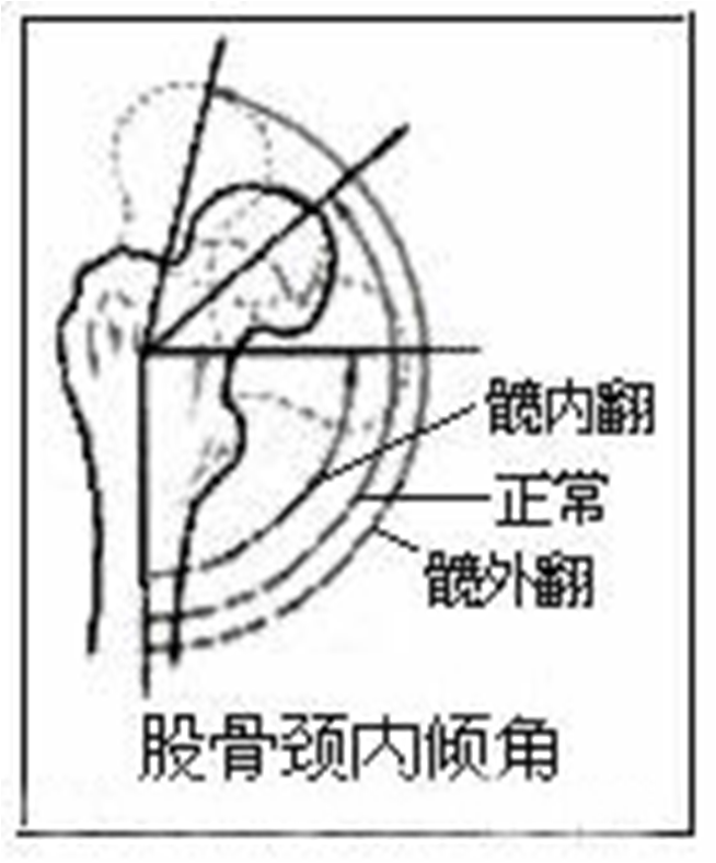 股骨颈和股骨体之间较大的病理倾斜角度被称为髋外翻;较小的倾斜角度称为病理性髋内翻。单侧髋外翻导致该侧腿较长,并伴有膝内翻。单侧髋内翻导致该侧腿较短,并伴有膝外翻。