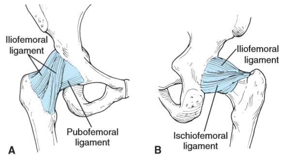 髂股韧带是人体强有力的韧带之一,起于髂前下棘,向下呈“人”字形,经关节囊前方止于转子间线。主要作用是加强前部关节囊,限制大腿过伸(使其只能伸15°左右),限制髋关节外旋;耻股韧带加强关节囊的前下方,可限制髋的外展;坐股韧带虽然也是加强后方关节囊,但是能防止髋关节过度内收内旋。