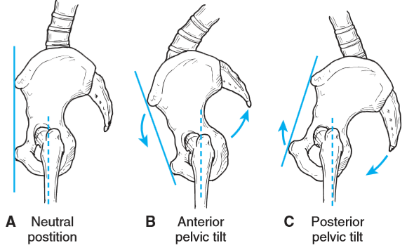 骨盆连接脊柱和下肢。骨盆的运动引起髋关节和腰椎关节的运动。臀部的肌肉组织通过相反的动作造成骨盆运动。屈髋肌使骨盆前倾;伸髋肌使骨盆后倾;外展肌和内收肌,使骨盆向外侧倾斜。旋转肌使骨盆旋转。当股骨在髋关节上移动时,为了防止过度的骨盆运动,骨盆必须由腹肌,竖脊肌,多裂肌和腰方肌稳定。
