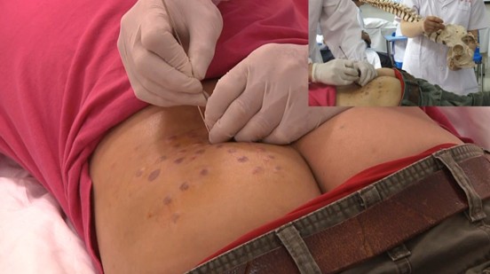 5. 密集型银质针:通过病例演示,结合骨架讲银质针针刺部位和针刺手法,观看软组织松解手术录像,掌握密集型银质针疗法。密集型银质针疗法可达到软组织松解手术“三切三离”的要求,消除无菌性炎症,获得远期的治痛效果。